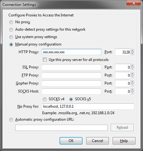 Then choose "manual proxy configuration" and enter the IP address you entered in your squid.conf file above (>http_port xxx.xxx.xxx.xxx:3128)